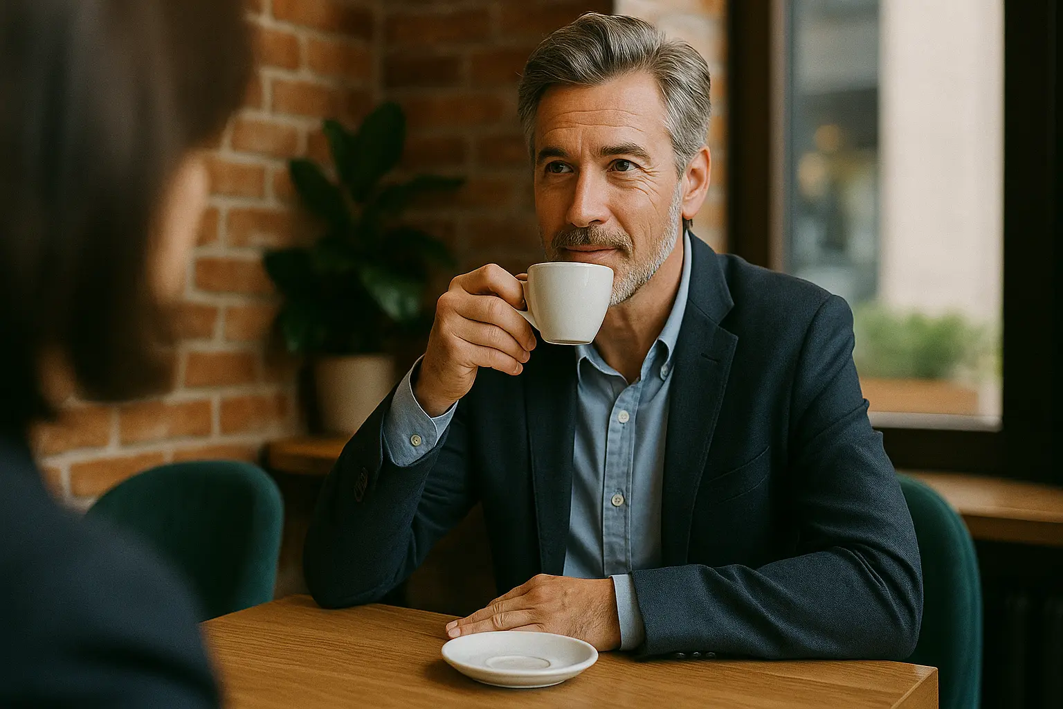 Clara regresaba a la ciudad con buen ánimo y decidió detenerse a almorzar en un café antes de volver a la oficina. Al entrar al café, su mirada se fijó de inmediato en un hombre que estaba sentado en una mesa, tomando café. A primera vista le resultaba familiar, pero no podía recordarlo concretamente.