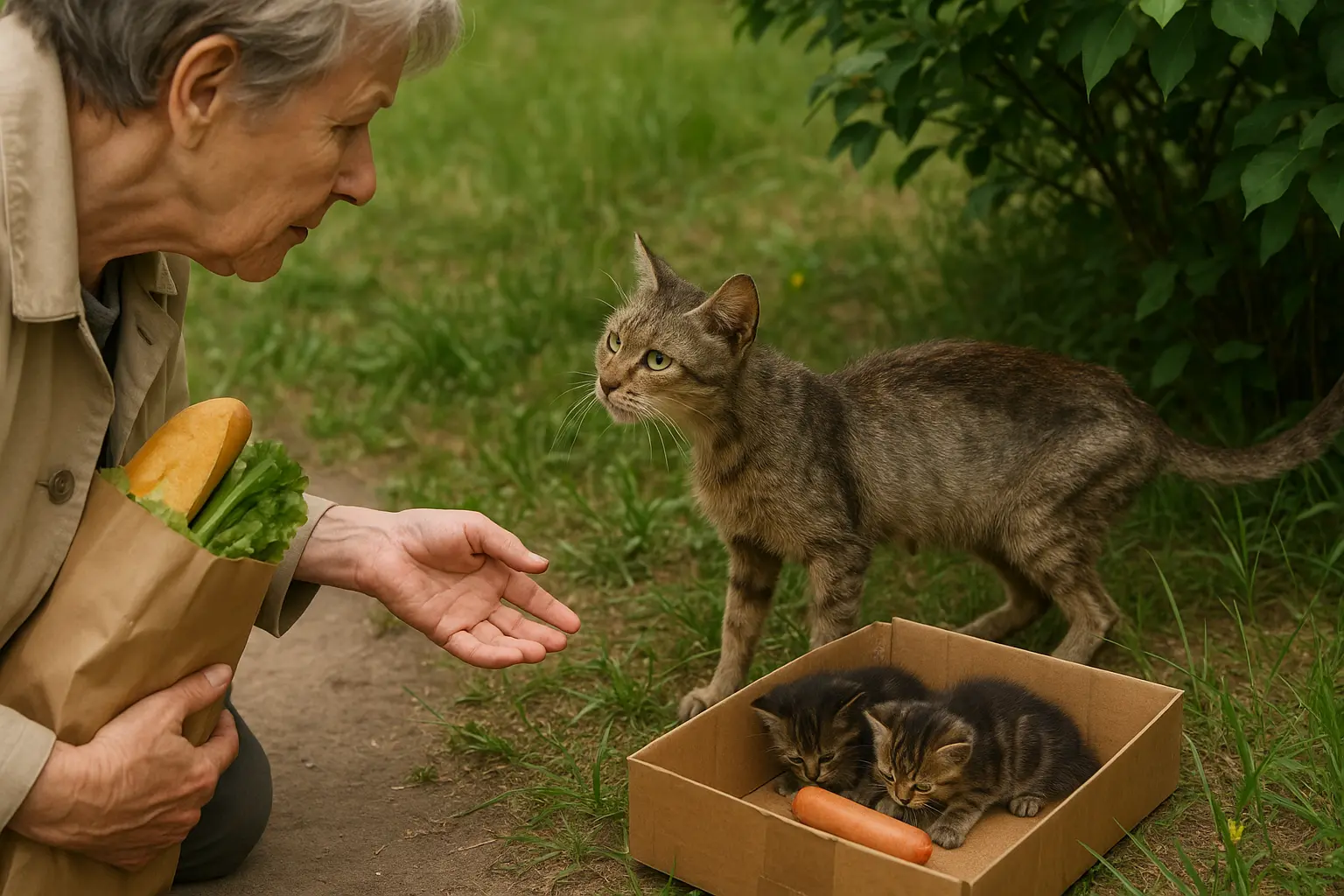 Una tarde de primavera, después de visitar a su hijo, regresaba a casa con una bolsa de compras cuando algo inesperado ocurrió. Una gata muy delgada se lanzó a sus pies, casi haciéndola tropezar. La gata miraba con urgencia la bolsa de comida. Elena vio en ella hambre, miedo y también cansancio. Al seguirla entre unos arbustos descubrió una caja de cartón con tres gatitos que intentaban comer una misma salchicha. La gata no comía; solo observaba.